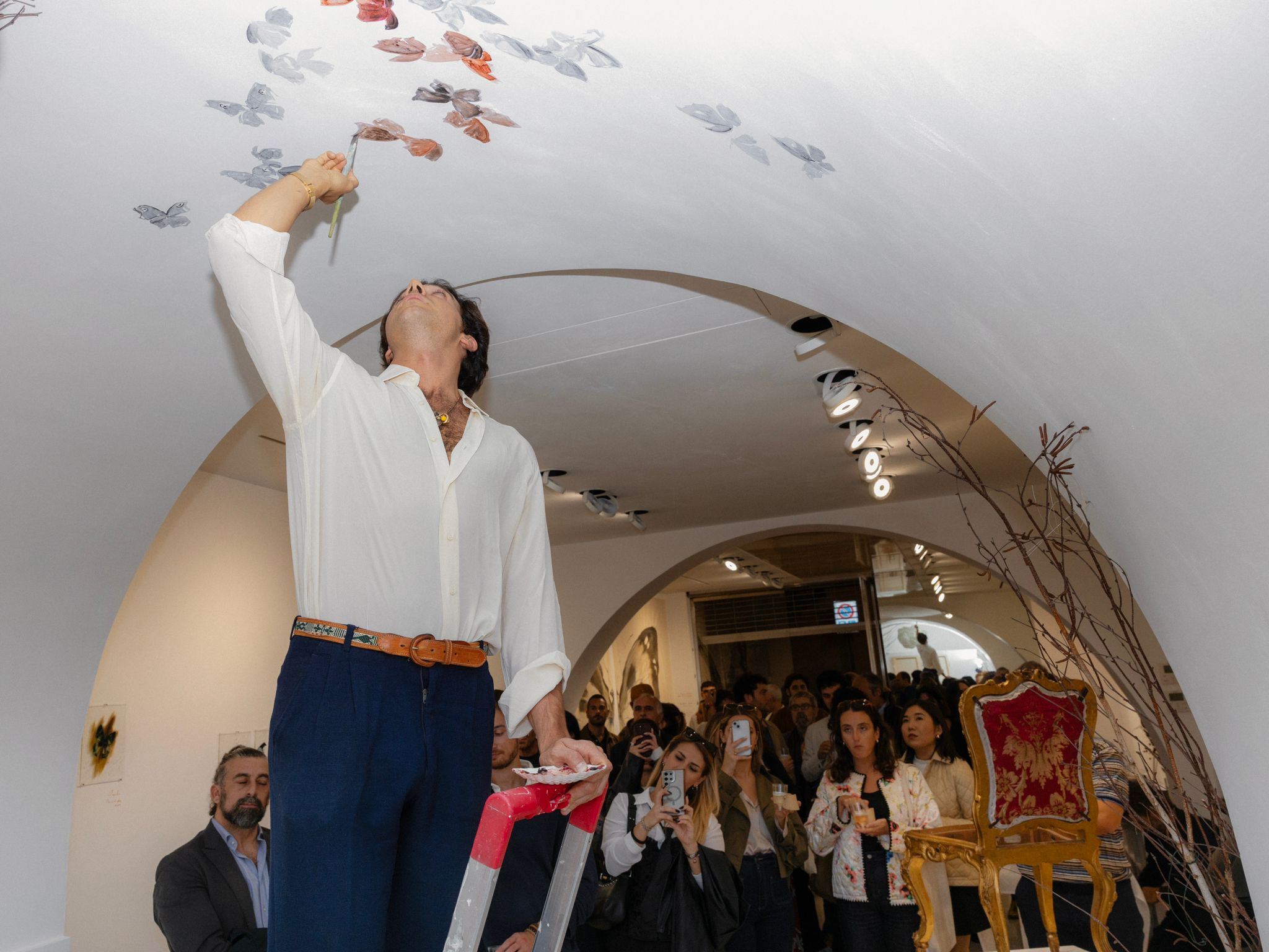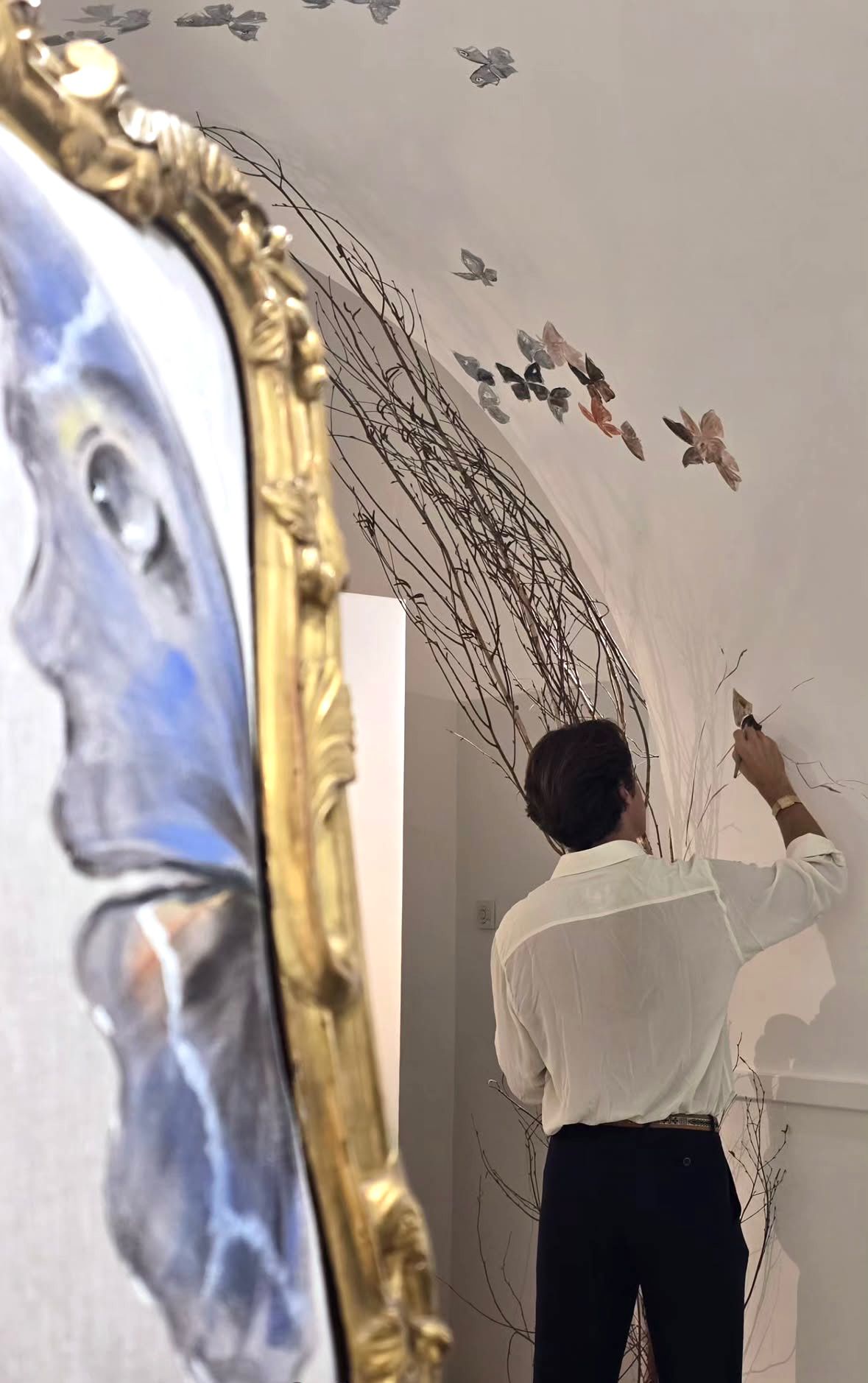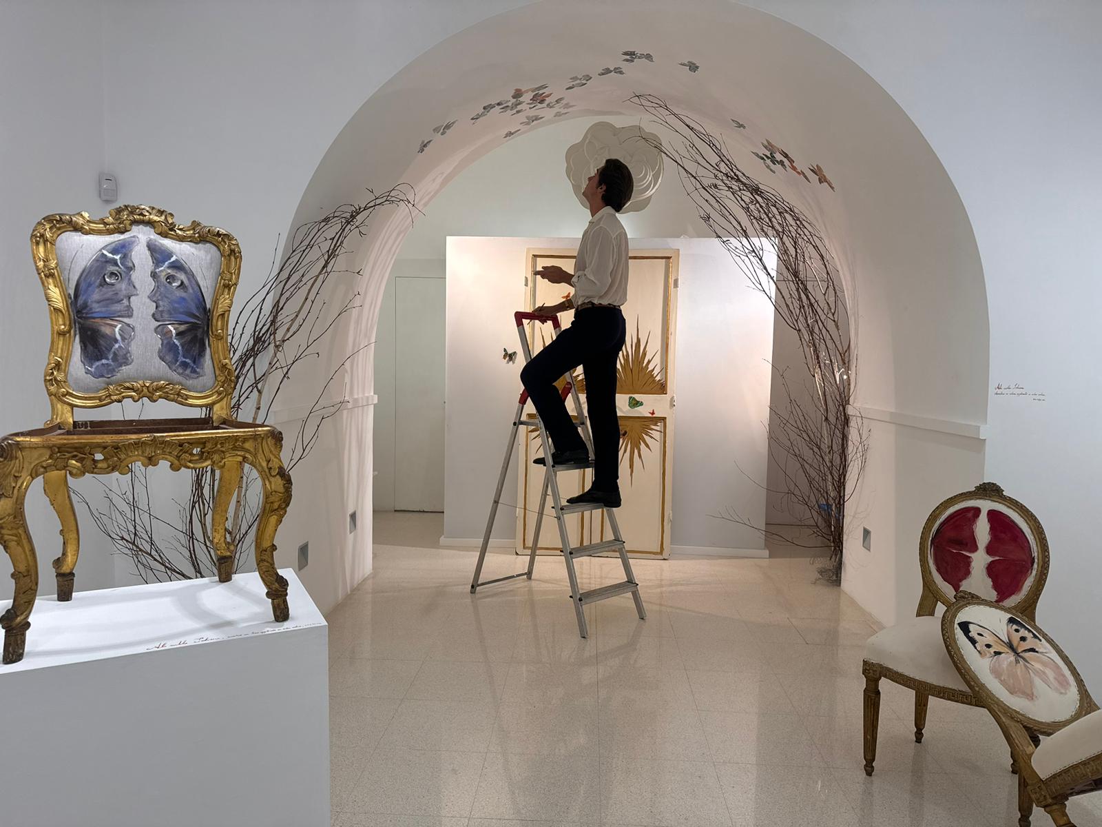 L’artista romano propone negli spazi storici della Galleria, fino al 28 ottobre, un corpus di lavori che intreccia la pittura su tela agli interventi su clessidre, specchi e cornici antiche, creando un microcosmo in cui coesistono natura, memoria e ornamento. «Ogni farfalla non è solo espressione delle sfaccettature presenti in natura, ma di una possibile connessione tra culture ed epoche. Ci ricorda che anche il gesto più piccolo può generare conseguenze immense», spiega l’artista.